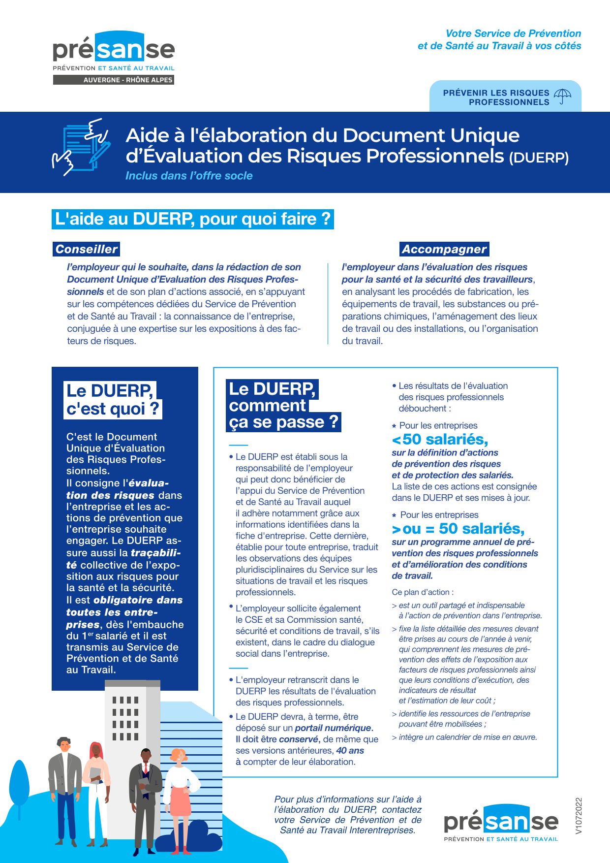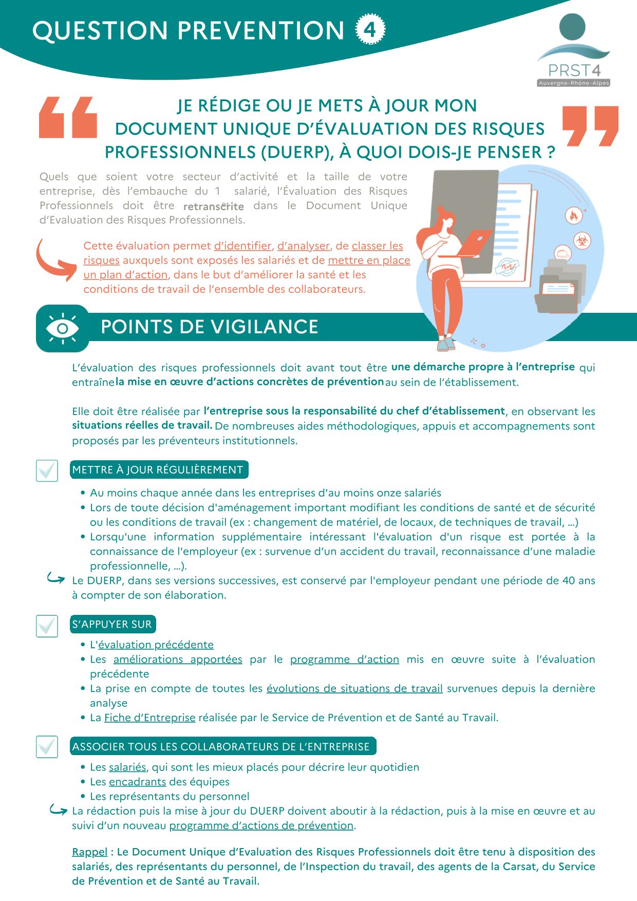 Campagne de communication Au secours je dois rédiger mon Document Unique, comment faire ? Dernière modification : 1 octobre 2024 Retrouvez les ressources mises à disposition pour répondre à cette thématique : Aide à l'élaboration du DUERP (192.7 Ko) La création et la mise à jour de la Fiche d'Entreprise (218.2 Ko) Je rédige ou je mets à jour mon DUERP, à quoi dois-je penser ? (718.3 Ko)