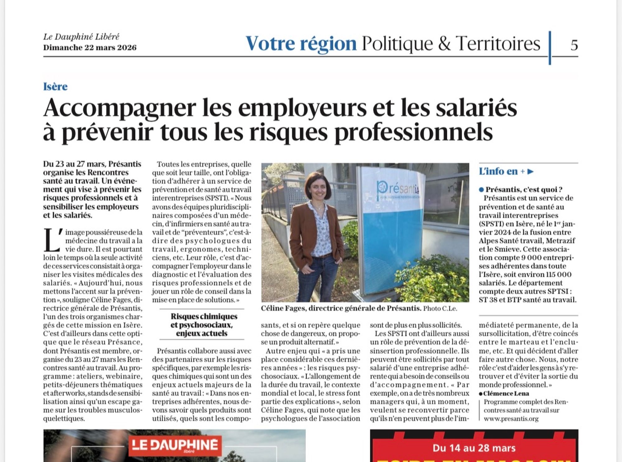 Les RST 2026 en Auvergne-Rhône-Alpes Retour en images Du 23 au 27 mars 2026, le réseau Présanse et les Services de Prévention et de Santé au Travail Interentreprises (SPSTI) ont donné rendez-vous aux entreprises partout en France pour une nouvelle édition des Rencontres Santé-Travail. Presantis dans le Dauphiné Libéré