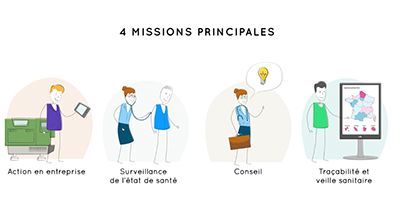 Avec le décret 2016-1908 du 27 décembre 2016 relatif à la « modernisation de la médecine du travail », les 4 missions légales du Service de Santé au Travail Interentreprises sont confortées et rééquilibrées : action en entreprise, conseil, surveillance de l'état de santé, traçabilité et veille sanitaire.