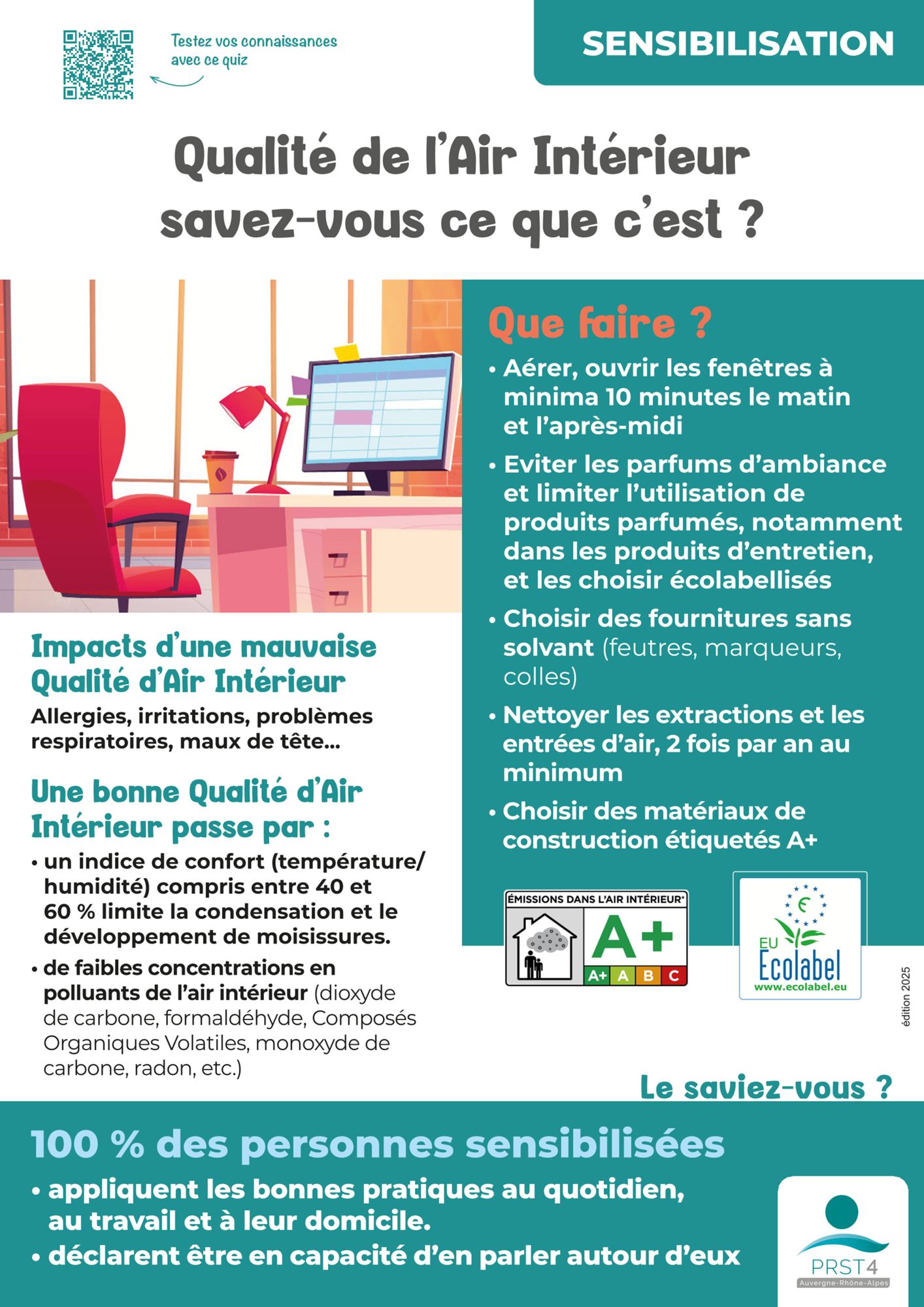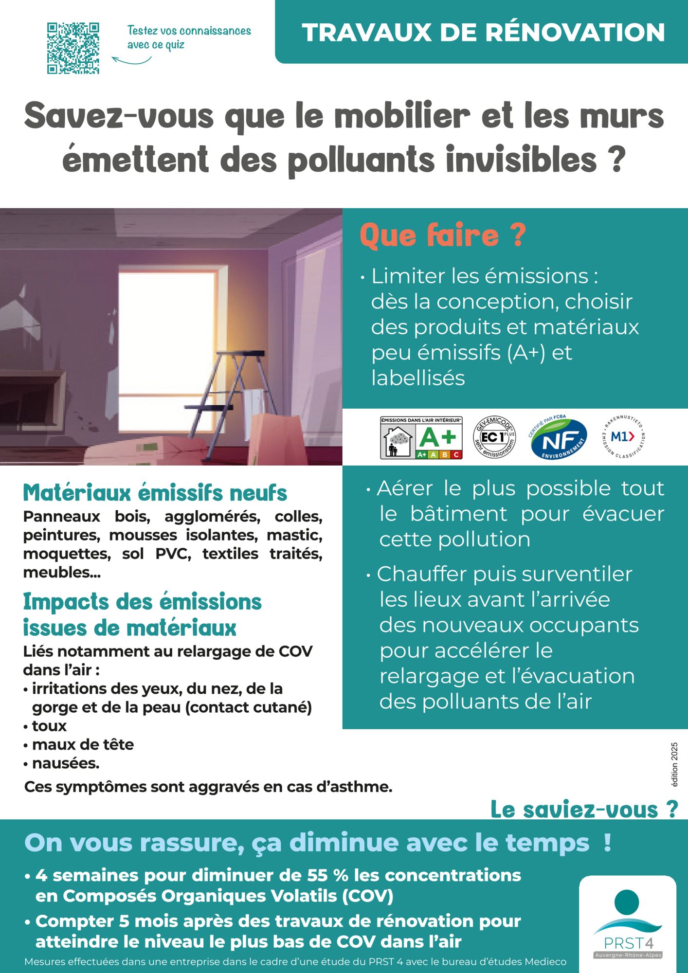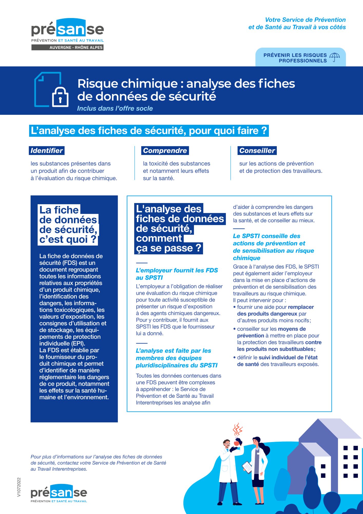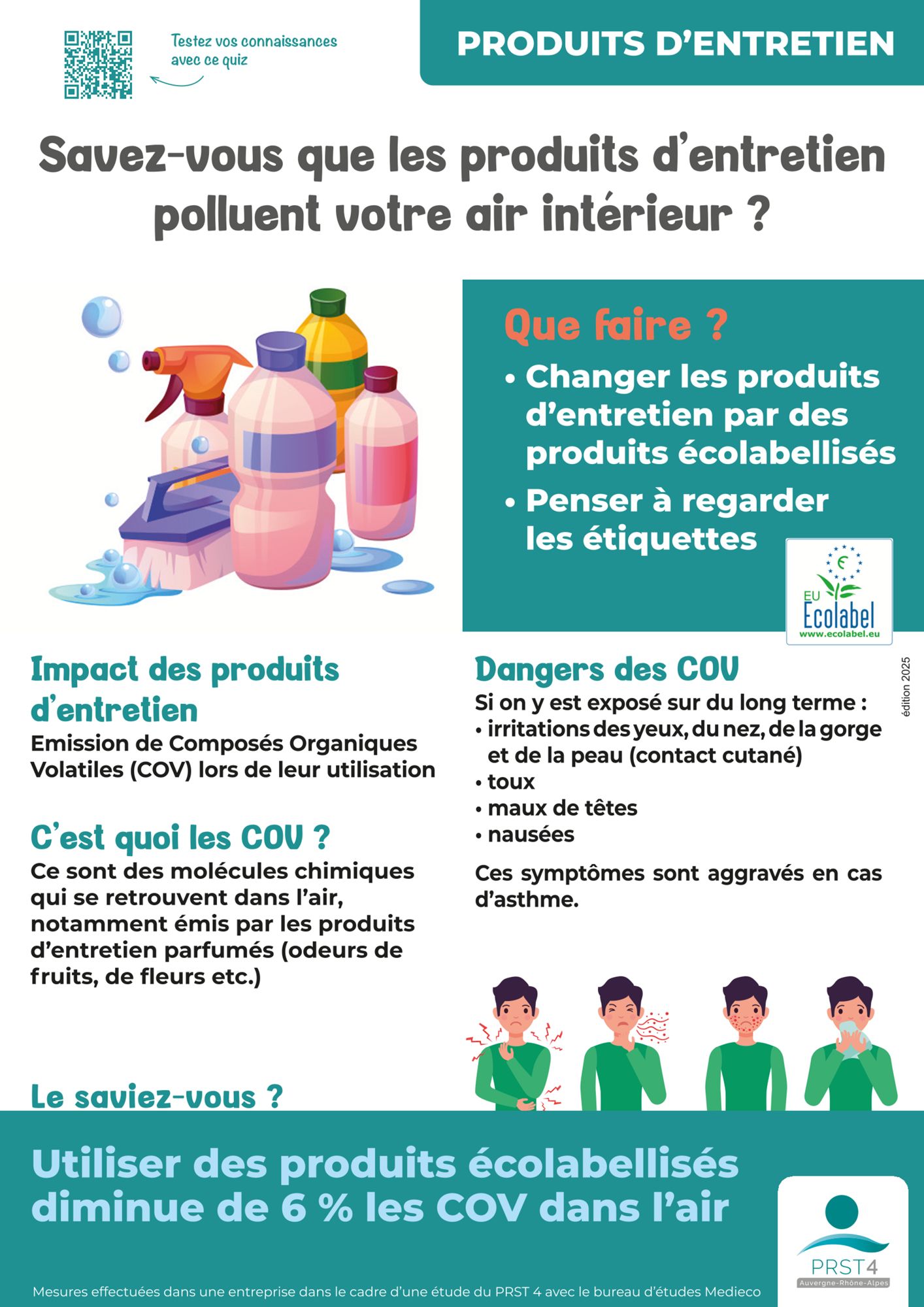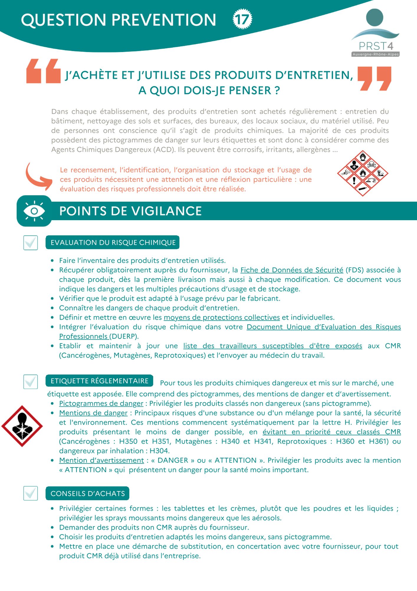Zoom sur le Risque Chimique Le risque chimique est partout.Les professionnels des SPSTI sont là pour vous aider à l'identifier. Testez vos connaissances avec nos quiz : Les Reprotoxiques et les femmes enceintes ou allaitantes La silice cristalline La ventilation Les CMR Voici les ressources à votre disposition pour cette thématique : Analyse des Fiches de Données de Sécurité (219.7 Ko) Le suivi post-exposition (288.9 Ko) Voici les ressources du PRST4 à votre disposition pour cette thématique : Question Prévention : J'achète et j'utilise des produits d'entretien, à quoi dois-je penser ? (657.9 Ko) Avez-vous pensé à ouvrir la fenêtre ? (745.8 Ko) Savez-vous que les produits d'entretien polluent votre air intérieur ? (2.3 Mo) Savez-vous que le mobilier et les murs émettent des polluants invisibles ? (738.7 Ko) Qualité de l'air intérieur, savez-vous ce que c'est ? (811.9 Ko)