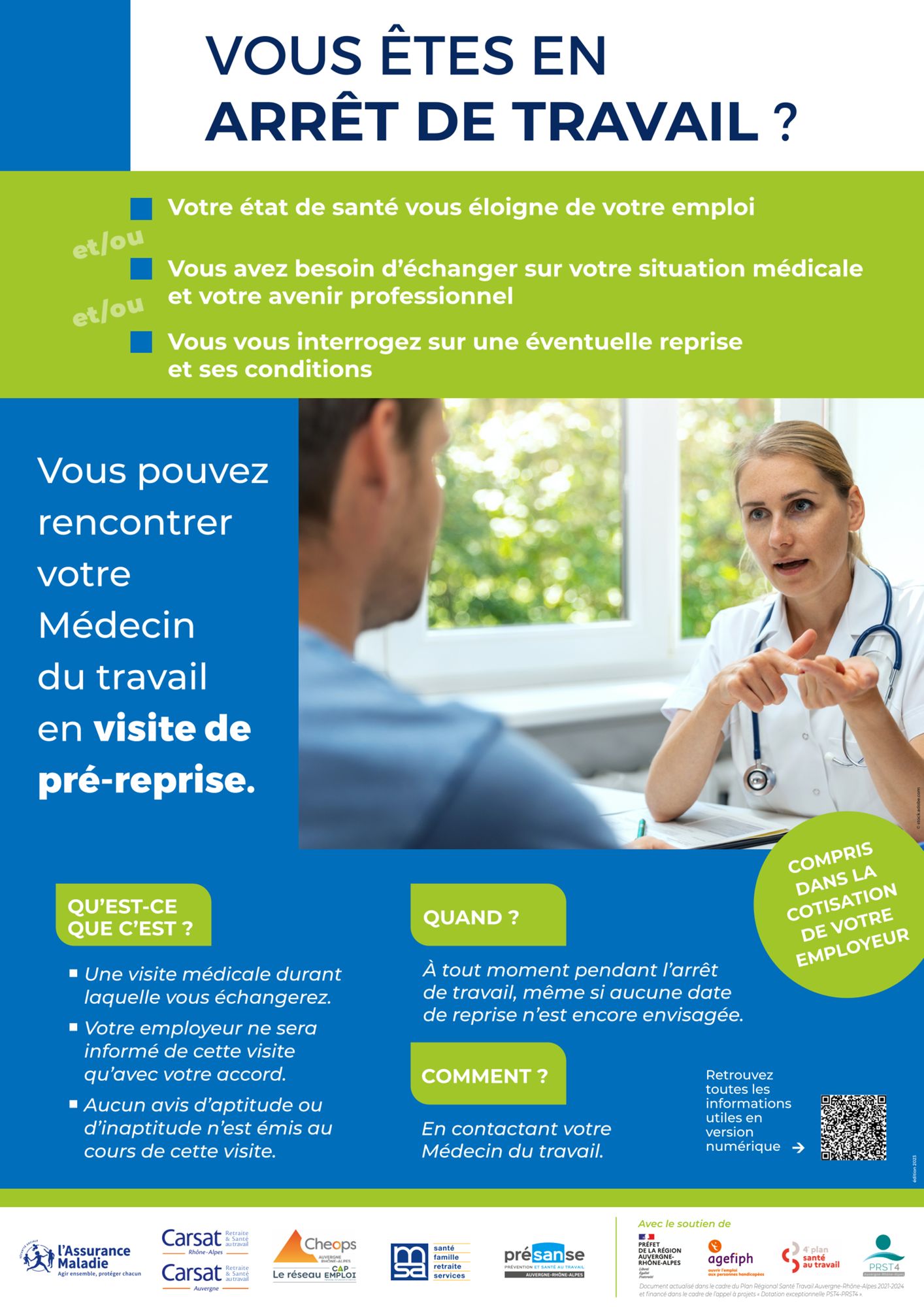 Les différents acteurs de la santé au travail et du maintien dans l’emploi du Rhône ont conçu cette affiche. Elle informe les salariés de la possibilité de demander une visite de pré-reprise.