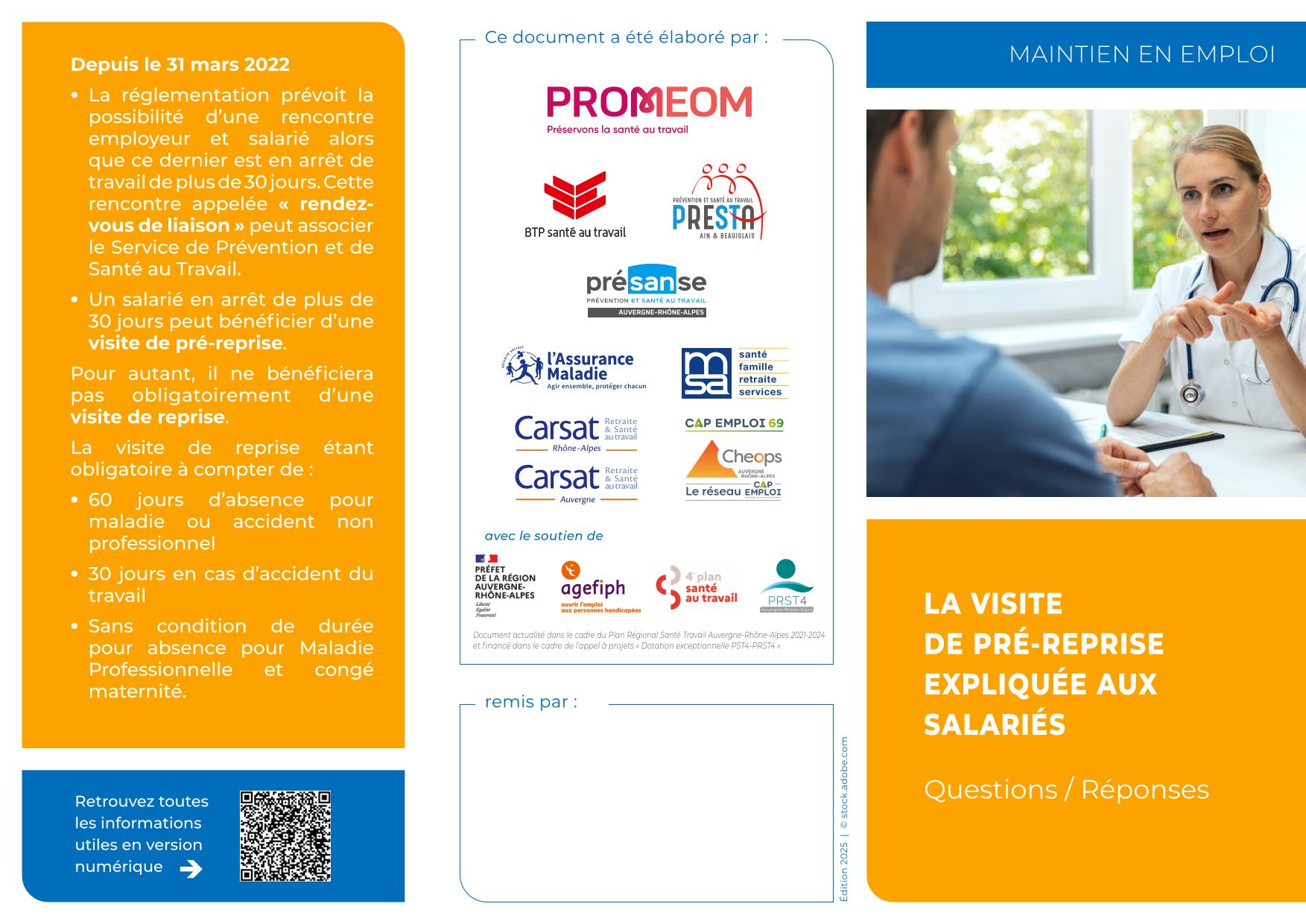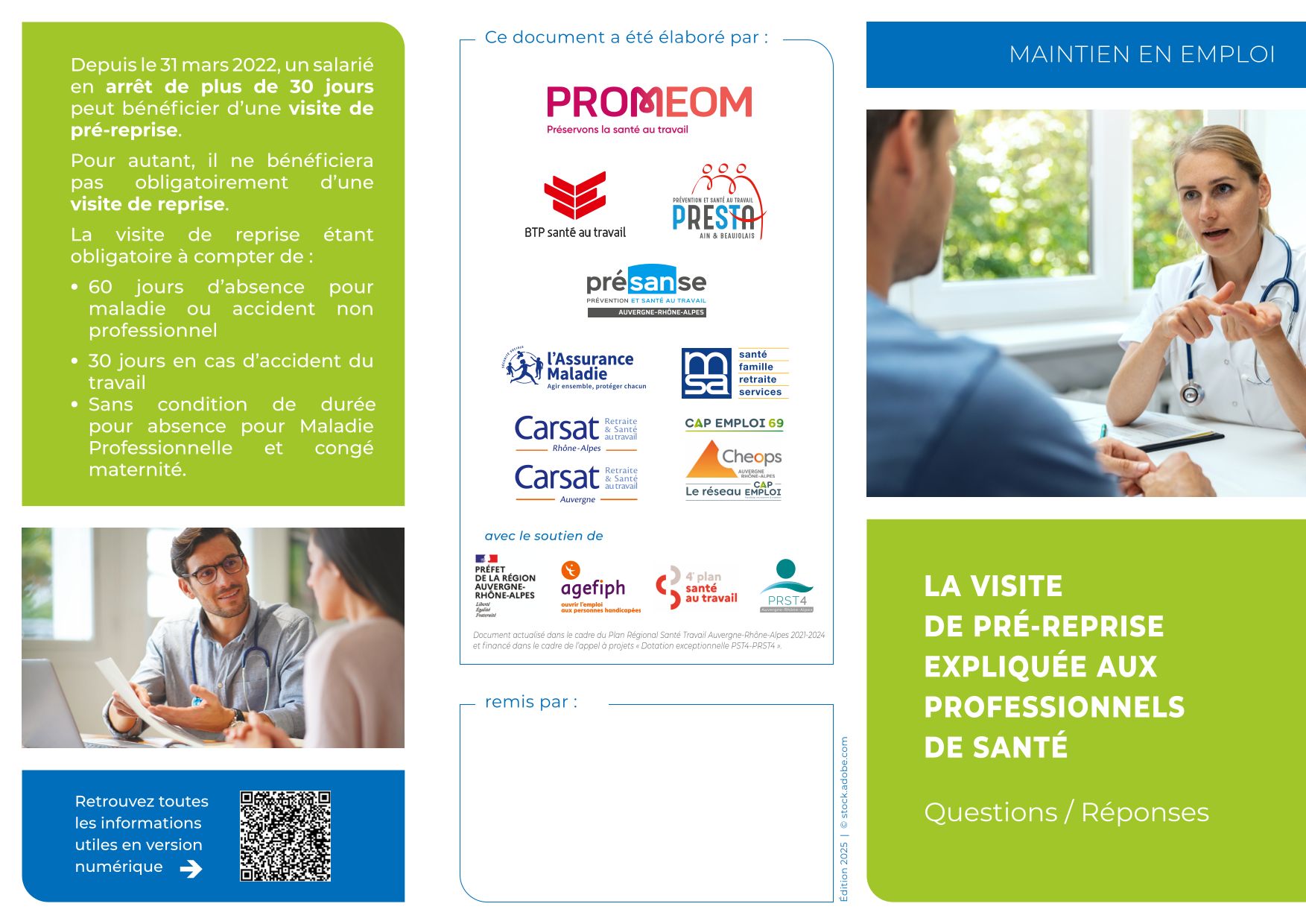 En 2022, les partenaires du maintien en emploi du Rhône (Services de Prévention et de Santé au Travail, MSA, Assurance Maladie, Carsat, Cap emploi), avec le soutien de la DREETS AuRA et de Agefiph, ont élaboré un "Kit Visite de pré-reprise" destiné aux salariés, employeurs et professionnels de santé.